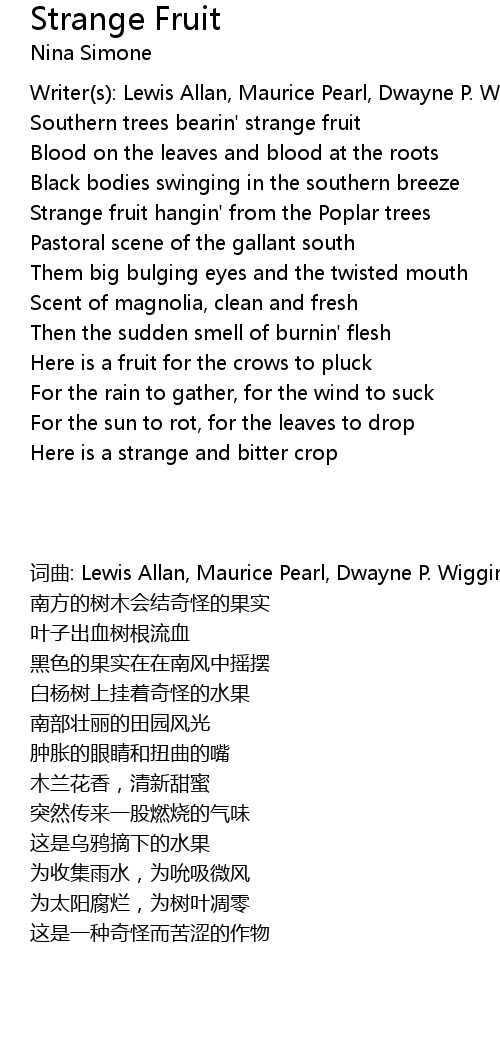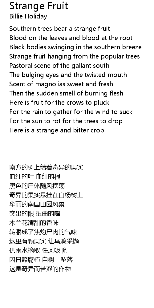 Hey Guys! This is the new Strange Fruit's music video from the legend song, "Blue". This song will be hype cause this new version . Strange Fruit Lyrics are a topic that is being searched for and liked by netizens nowadays. You can Download the Strange Fruit Lyrics here. Save all royalty-free images. Billie Holiday Strange Fruit with Lyrics on Screen, .